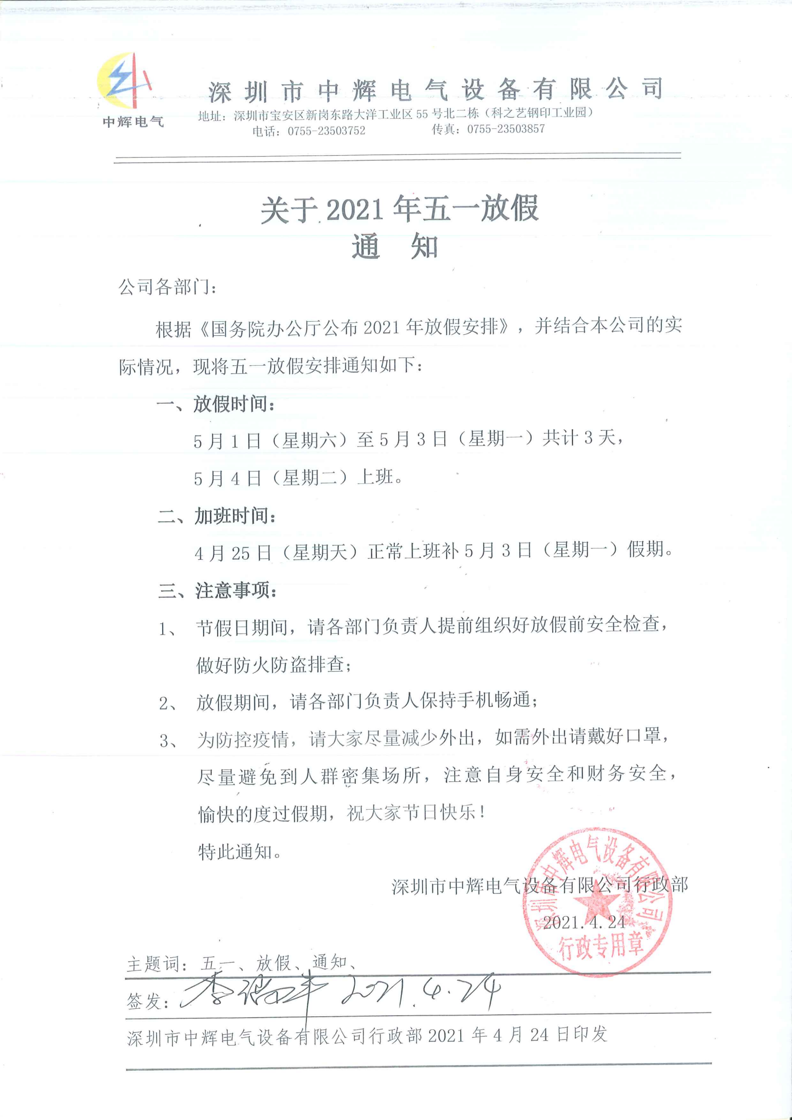 - 中輝電氣勞動節(jié)放假通知 10-13